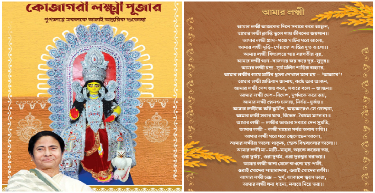 কোজাগরী লক্ষ্মী পুজো উপলক্ষে রাজ্যবাসীকে আন্তরিক শুভেচ্ছা ও অভিনন্দন জানালেন মুখ্যমন্ত্রী মমতা বন্দ্যোপাধ্যায়। উৎসবের এই বিশেষ দিনে সকলকে চমকে দিয়ে তিনি তাঁর নিজের লেখা ও সুরে একটি নতুন গান ভাগ করে নিলেন সমাজমাধ্যমে।