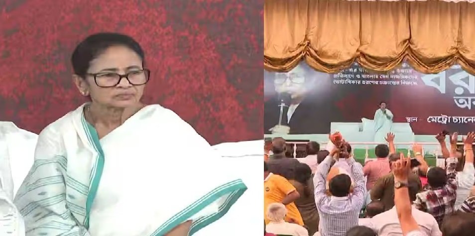 রাষ্ট্রপতি দ্রৌপদী মুর্মুকে ঘিরে কেন্দ্র-রাজ্য তরজা এবার চরমে। প্রধানমন্ত্রী নরেন্দ্র মোদীর ‘অপমান’ সংক্রান্ত অভিযোগের পালটা দিতে গিয়ে খোদ প্রধানমন্ত্রীর বিরুদ্ধেই নারী ও দেশের সর্বোচ্চ সাংবিধানিক পদের অবমাননার অভিযোগ তুললেন মুখ্যমন্ত্রী মমতা বন্দ্যোপাধ্যায়। রবিবার ধর্মতলায় ধরনা মঞ্চ থেকে একটি বড় ব্যানারে পুরনো একটি ছবি তুলে ধরে মোদীকে তীব্র আক্রমণ শানান তৃণমূল নেত্রী।