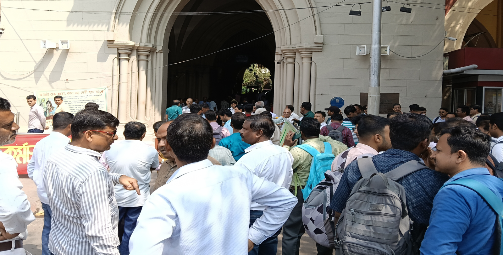 বকেয়া মহার্ঘ ভাতার (DA) দাবিতে রাজ্য সরকারি কর্মচারীদের ডাকা ধর্মঘটে আজ কার্যত স্তব্ধ হয়ে গেল কলকাতা হাইকোর্ট। শুক্রবার সকাল থেকেই আদালতের মূল বি-গেটের বাইরে দফায় দফায় বিক্ষোভ দেখান সরকারি কর্মীরা। পরিস্থিতি এমন পর্যায়ে পৌঁছায় যে, খোদ প্রধান বিচারপতি সুজয় পাল এজলাসে উপস্থিত থাকলেও দেখা মিলল না মামলাকারীদের আইনজীবীদের। এমনকি অনুপস্থিত ছিলেন কোর্ট অফিসাররাও।